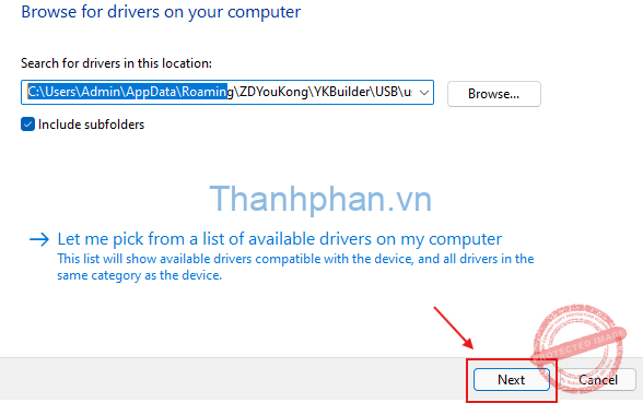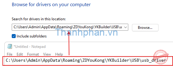Sao chép ( copy ) đường dẫn trên và dán ( paste ) vào ô bên dưới của “Browse for driver” như hình dưới: “C:\Users\Admin\AppData\Roaming\ZDYouKong\YKBuilder\USB\usb_driver“